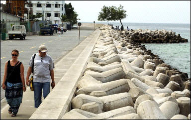 The initial response to this threat was to begin construction of a series of breakwaters on the outer coast of Male, which will protect the capital from damaging storm waves. Nevertheless, they would not prevent a flooding from a sustained rise in water levels. Fortunately, even a one meter rise in sea level would leave Male somewhat above the level of high tide.