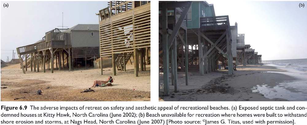 Allowing shores to retreat can be disruptive. If coastal erosion is gradual, one often sees a type of coastal blight in what would otherwise be a desirable community, with exposed septic tanks and abandoned homes standing on the beach, and piles of rocks or geotextile sand bags in front of homes that remain occupied (Figures 6.8b and 6.9). If homes are destroyed during a storm, communities can be severely disrupted by the sudden absence of neighbors who previously contributed to the local economy and sense of community (IPCC, 1990; Perrin et al., 2008; Birsch and Wachter, 2006). People forced to relocate after disasters are often at increased risk to both health problems (Yzermans et al., 2005) and depression (Najarian et al., 2001).