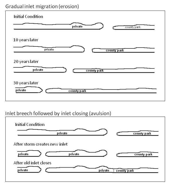 Public access usually does not migrate inland where it has been obtained by means other than the public trust doctrine. As a general rule, a landowner can grant someone else the right to cross her own land. (Such a right is generally called an easement. Chapter 3 discusses easements in greater detail.[83]) But a waterfront owner cannot sell what she does not own, such as the right to cross a neighbors land. Therefore, the dry beach easement conveyed by the owner of one parcel cannot migrate to an inland parcel. Consider the many communities where government agencies have purchased or otherwise acquired public access along privately owned beaches whose title extends to mean high water. The public access is along beaches over parcels that are waterfront today, but not across parcels that are not even along the water. Suppose the shore erodes so that todays beaches become water and the beach migrates onto land that currently is the second row of lots back from the ocean. The public will not have access along the new dry beach.[84] It will still have access across land that was previously the dry beach; but pedestrian access will not be feasible if the mean high tide line is regularly flooded by the runup from large waves.