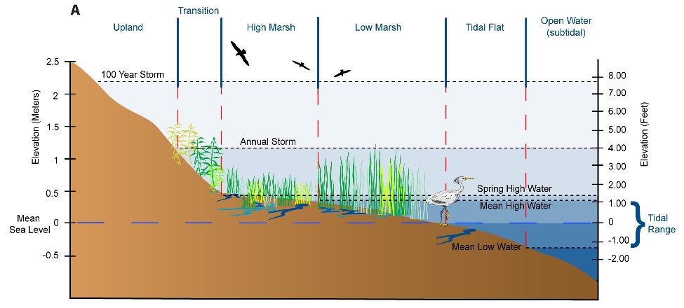 For purposes of rolling easements, a key difference between wetland shores and ocean beaches is that tidal flooding, rather than waves, governs the conversion from dry land to intertidal habitat (see Box 2).