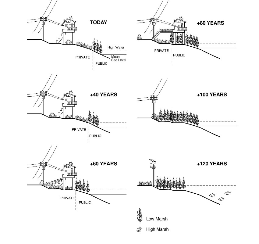 Figure 6 shows how this rolling easement could play out over time for the typical case where the private/public boundary is mean high water,[106] and therefore the high marsh is privately owned while the low marsh is publicly owned. A rolling easement allows construction near the shore, but requires the property owner to recognize natures right-of-way to advance inland as sea level rises. In the case depicted, the high marsh reaches the footprint of the house 40 years later. Because the house is on pilings, it can still be occupied, assuming that it is hooked to a sewerage treatment plant. (A flooded septic system would probably fail, because the drain field must be a minimum distance above the water table.) After 60 years, the marsh has advanced enough to require the owner to park her car along the street and construct a catwalk across the front yard. After 80 years, the marsh has taken over the entire yard; moreover, the footprint of the house is now seaward of mean high water, and hence is on public property. At this point, additional reinvestment in the property is unlikely. Twenty years later, the particular house has been removed, although other houses on the same street may still be occupied. Eventually, the entire area returns to nature.