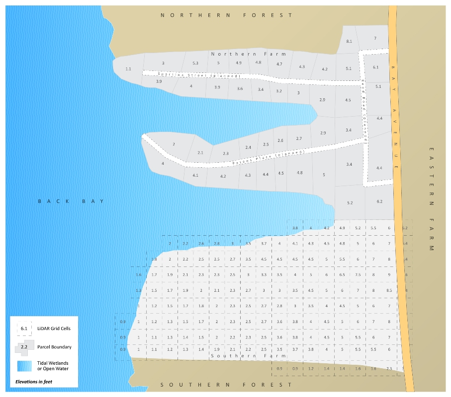 A completely different way to ensure that ecosystems and public access migrate inland is for land ownership to terminate when something happens. Homeowners usually own land in fee simple absolute, which means that ownership lasts forever. An alternative approach is to split the land title into two periods of time: If a parcel is 4 feet above spring high water, for example, the buyer could own the land until the sea rises 4 feet, after which ownership would be transferred to TLC. Under such an arrangement, the buyer owns a defeasible estate while TLC owns a future interest. Other parcels with different elevations could transfer when the sea reaches different heights.[233] (See Figure 9.)