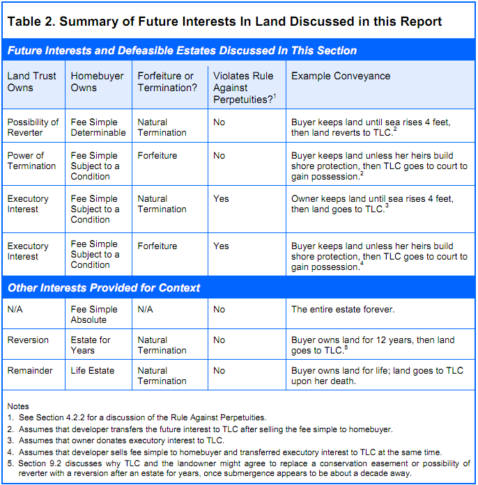 - Original owner retains a fee simple subject to a condition subsequent by transferring to TLC an executory interest entitling it to take over the property when something happens (e.g., sea level rises 4 feet).