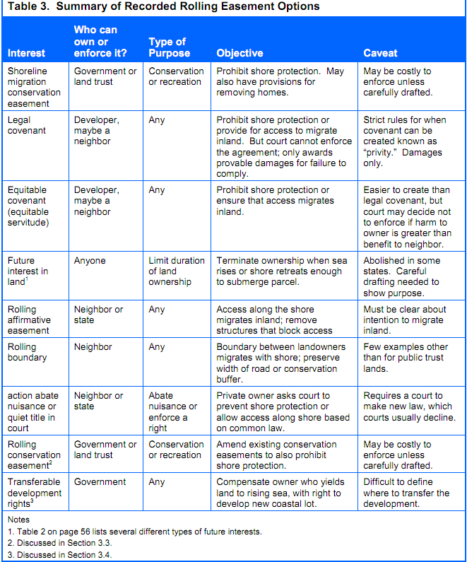 Table 3 summarizes the recorded rolling easement options examined in this primer. The most appropriate option depends largely on the objectives of the rolling easement and whether a government, land trust, neighbor, or developer is attempting to ensure that ecosystems or access migrate inland. Nevertheless, in most cases, more than one option is available that could serve the purpose. As the final column shows, however, none of the options can be guaranteed to achieve the objective under all circumstances. As we discuss in the next section, combinations of rolling easements may be more reliable than a single option. Careful drafting, study of the law in a given state, and management of the easement once it is created can all increase the likelihood of success.