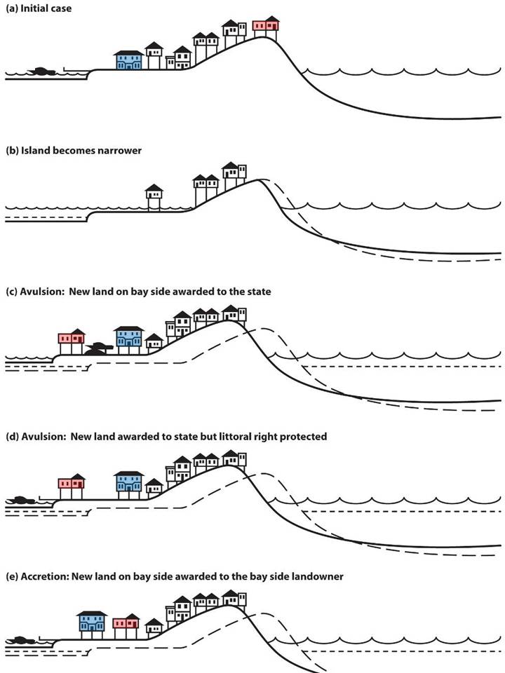 Parcel-by-Parcel. Under Roman Law, if the violence of the stream sweeps away a parcel of your land and carries it down to the land of your neighbor, it clearly remains yours .[321] Although courts have never extended that principle to the case where a hurricane washes a parcel from the ocean to the bay side of an island, the same framework could apply to barrier islands. Rolling easements could facilitate the landward migration of a barrier island in ways similar to the retreating shores we have already examinedexcept that they must address the advancing bay shore, as well as the retreating ocean shore. The mechanics of an advancing bay shore would in some ways be the mirror image of the rolling easement along the ocean shore.