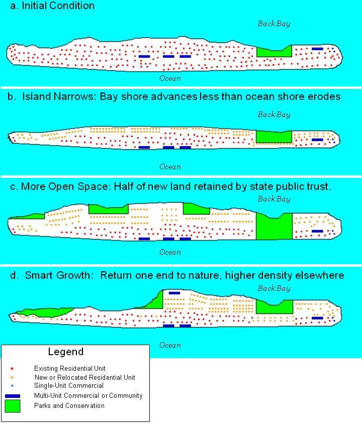 A final possibility is to use transferable development rights to return (for example) half of the island to nature. In Figure 12d, new bayside lands are created on the eastern half of the island, but very little new land is created on the western half (and that land is wetlands similar to what might have been created naturally had human activities not disabled the overwash process). All new development takes place on the eastern half of the island. A gradual depopulation takes place on the western half of the island, with no new development. As the shore erodes, eventually there will be no homes along the western end of the island; so that end of the island could be returned to nature. Possibly an inlet will eventually separate the undeveloped west end from the developed east end. Similarly, transferable development rights could facilitate shifting all development on one island to an adjacent island. Such a redevelopment scheme could increase the amount of natural barrier island habitat, reduce the amount of ocean shoreline requiring costly shore protection, and increase the economic feasibility of protecting the island to which the development is transferred.